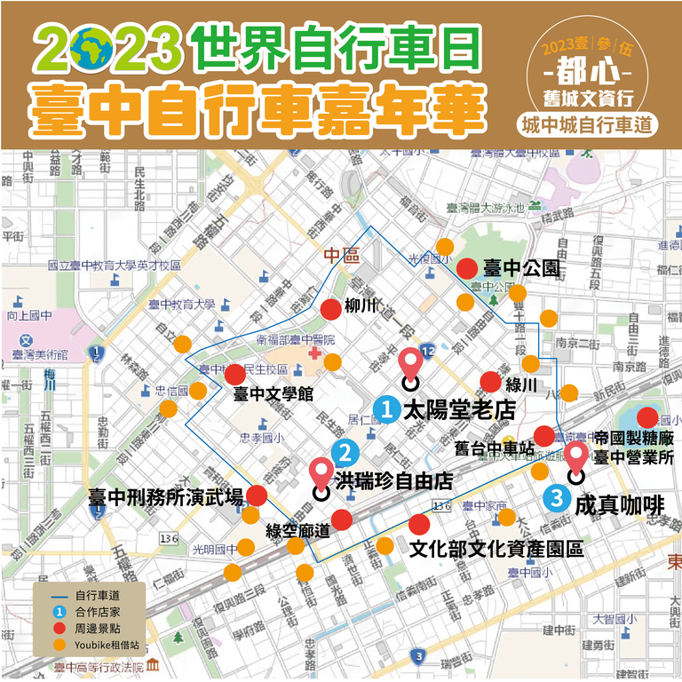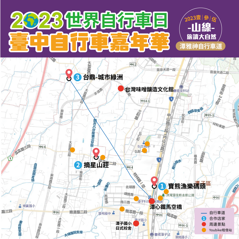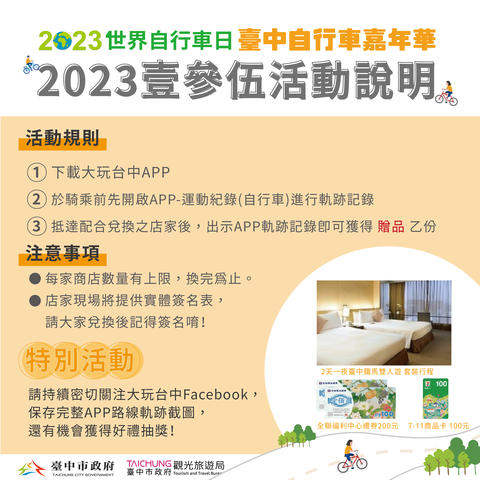 (二)活动说明:台中市是自行车产业重镇,我们有多元完善的自行车道、丰富的自然人文与地貌,民众到台中可同时享受自然生态、海线风光、城市人文,是最适合骑乘自行车的城市。本活动规划每「壹」条路线,沿途有「参」家配合店家,推广「伍」条具备山、海、屯、都心等不同特色的自行车路线,邀请民众沿着自行车道,探索美景和特色店家,完成指定任务後即可兑换限量赠品,还可以上传照片参加抽奖!
