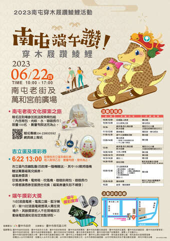 活动从上午10时延续到下午5时,在万和宫广场前舞台区规划一系列精彩表演,下午2点半众人踩街、手持响板绕行南屯老街欢庆端午,还有多项趣味游戏及穿木屐竞走活动;另参加踩街民众,下午1时起可排队领取限量「吉立蛋」,内含南屯吉祥物咖咖造型钥匙圈1个及摸彩券1张,当天将抽出70寸液晶电视、电风立扇及蓝牙喇叭等奖项幸运得主。此外,好礼加码惊喜送,其中150颗吉立蛋随机赠送惊喜福气兑换券,幸运儿将有机会获得空气清净机等丰富好礼,邀请大家相约到台中南屯体验有别以往的端午节。
