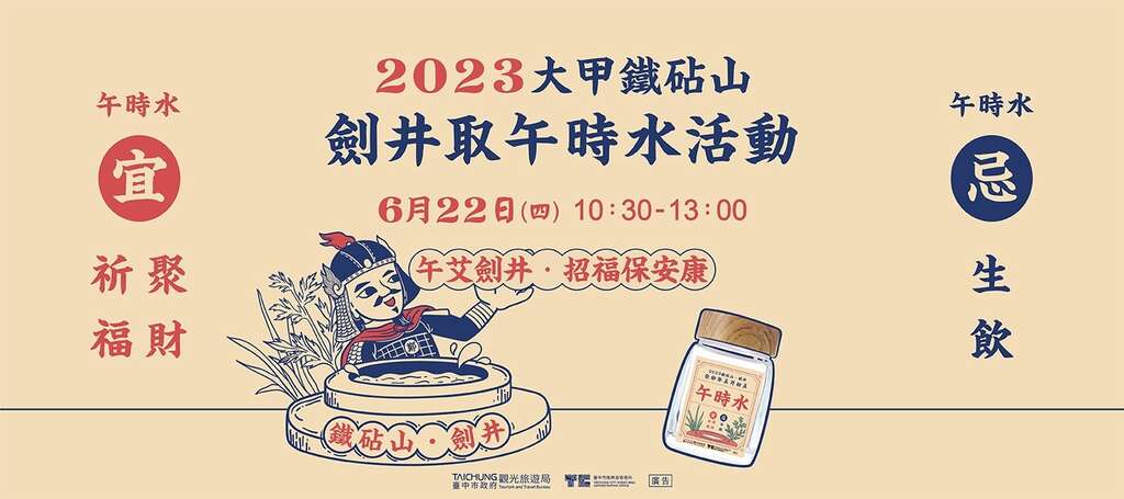 以推广端午节文化体验为主的「大甲铁砧山剑井取午时水活动」,每年皆吸引近千人前来朝圣,今年准备可开运除秽的端午安康双宝,包括500瓶午时水纪念瓶、150份端午民俗植物调配的午艾安康沐浴包,赠送给现场参与民众,也能体验立蛋、观赏端午民俗文化解说与音乐飨宴,感受浓厚的节庆气息,邀请民众一同体验端午节庆文化。