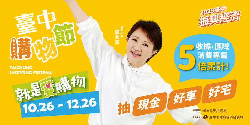 2023台中购物节开跑罗!10/26-12/26,在台中消费累计满500元就有一次抽奖机会,天天抽三千、周周抽十万、月月抽百万,隔周加码百万汽车、压轴再抽精品好宅,赶快下载台中通暨购物节APP,登录发票/合作店家收据,一起拚经济!