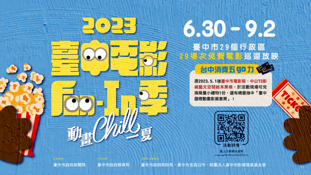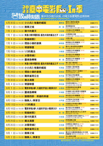 睽违3年重磅回归,深受大小朋友喜爱的暑期活动「台中电影Fun-In季」今年恢复举办,自6月30日至9月2日登场,巡回全台中29区,精选15部动画电影强片轮番放映,包含小小兵、冰雪奇缘、哆啦A梦、诸葛四郎等横跨台湾、欧美及日本的动画。