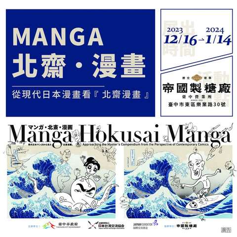 「Manga北斋漫画巡回展」先前在印度、义大利、美国等国家展出广受好评,首次登陆台湾,第一站来到「历史建筑帝国制糖厂台中营业所」,展出103件图画输出作品,包含浮世绘大师葛饰北斋、歌川国芳的戏画、鸟羽绘等作品,还有望月寿城、横山裕一等7位现代漫画家致敬北斋漫画的原作作品,让动漫迷感受流传两百多年北斋漫画独特魅力。