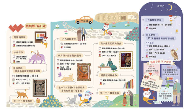 国立台湾美术馆为了庆祝325美术节,今年特别以艺术小旅行方式,介绍春季推出的三个重磅的艺术史主题展:「汇流溯源—国美典藏台湾早期书画展」、「日月颂—颜水龙与台湾」和「致未来世代的美术史」,及「目光之外—2024台湾国际光影艺术节」,为「家庭观众」、「一般观众」及「银发族观众」,规划设计了3至4月的半日、一日和夜间套装参观行程。看展览完成学习单,即可参加艺术商店购物优惠、餐厅餐点折价等,欢迎大小朋友到国美馆看展览,认识台湾艺术。