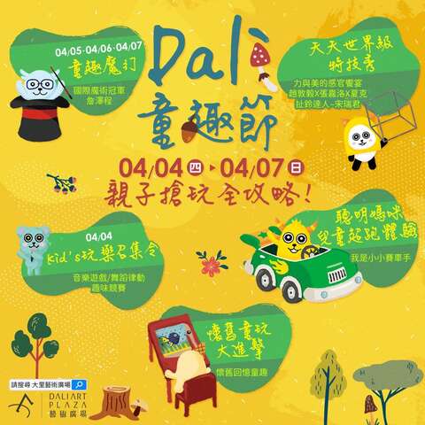 活动月份:2024-04-04~2024-04-07活动地点: 台湾台中市大里区大里艺术广场 加入Google行事历 活动内容儿童节连假来大里艺术广场,不只可以到乐园玩敲金蛋,拿游戏机,还可以免费看世界级魔术冠军、特技表演、消费满额免费玩多种复古童玩、音乐游戏、舞蹈律动、趣味竞赛拿奖品!一站式玩法,让大人小孩连假尽情放电! 详情请参考活动官网 相关连结 官网 相关照片