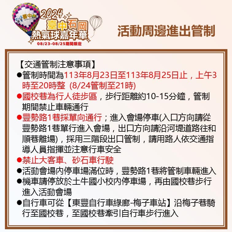 8月23日至25日都有免费接驳车,每15至20分钟发车一次,其中上午场提供东势河滨公园到土牛运动公园接驳;下午场则在石冈水坝、石冈区公所、情人木桥、交通大队梅子分队、土牛国小及东势河滨公园等接驳站行驶。民众如自行开车,可停在接驳站周边停车场,再搭乘接驳车至土牛国小,接着沿国校巷步行约10至15分钟,即可到达活动会场。