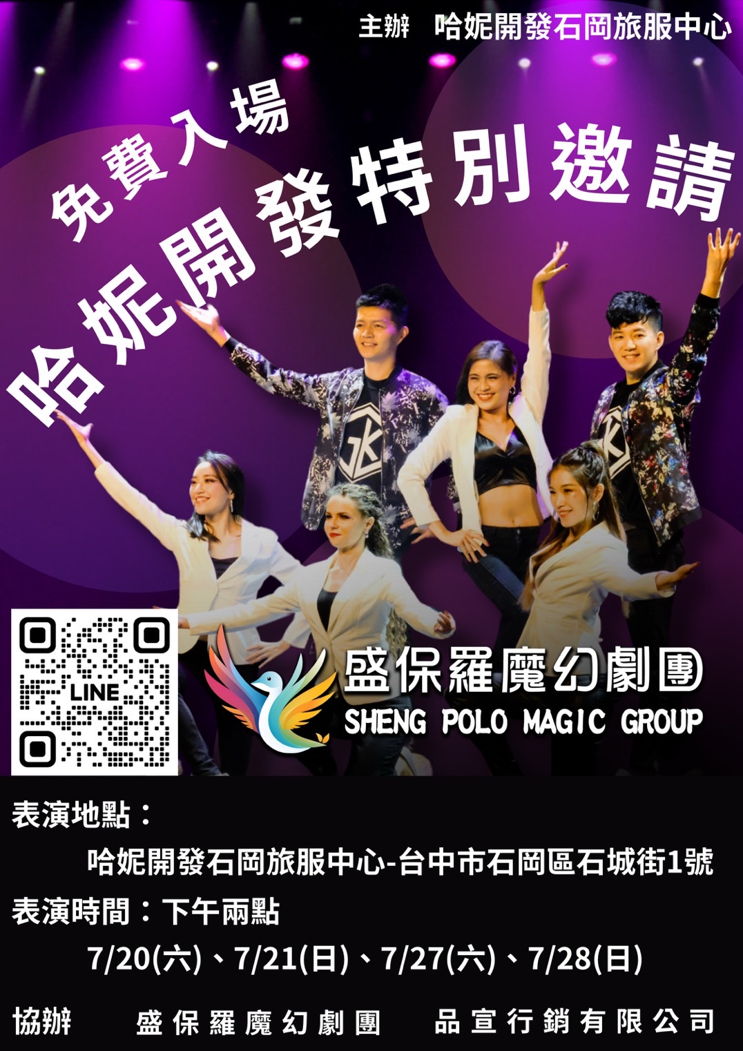 活动月份:2024-07-20~2024-07-28活动地点: 台湾台中市石冈区哈妮开发石冈旅服中心(石冈区石城街1号) 加入Google行事历 活动内容表演地点:哈妮开发石冈旅服中心(台中市石冈区石城街1号) 表演日期:7/20(六)、7/21(日)、7/27(六)、7/28(日) 表演时间:下午两点 相关照片