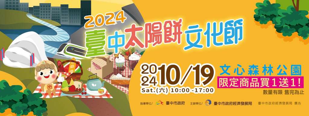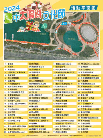 今年共有100家业者参与设摊,包含经典糕饼品牌元明商店、嘉味轩、陈允宝泉、阿聪师、蔷薇派、阿明师、太阳堂老舖、敏秀烘焙坊、翔记蛋黄酥、卡但屋及波士顿烘焙坊;好饼配好茶,有鱼池乡公所精选的10家红茶及农产业者,还有欧客佬咖啡、3点1刻、茶境天使等咖啡茶饮;台中好甜、经典伴手礼品牌同样精彩,包含旅人票亭、PINTRUE品醋迷、左心房、巴部屋、熊介巧、小林煎饼、大呷面本家、正昇豆腐乳等,各家优惠数量有限,欢迎民众踊跃莅临。