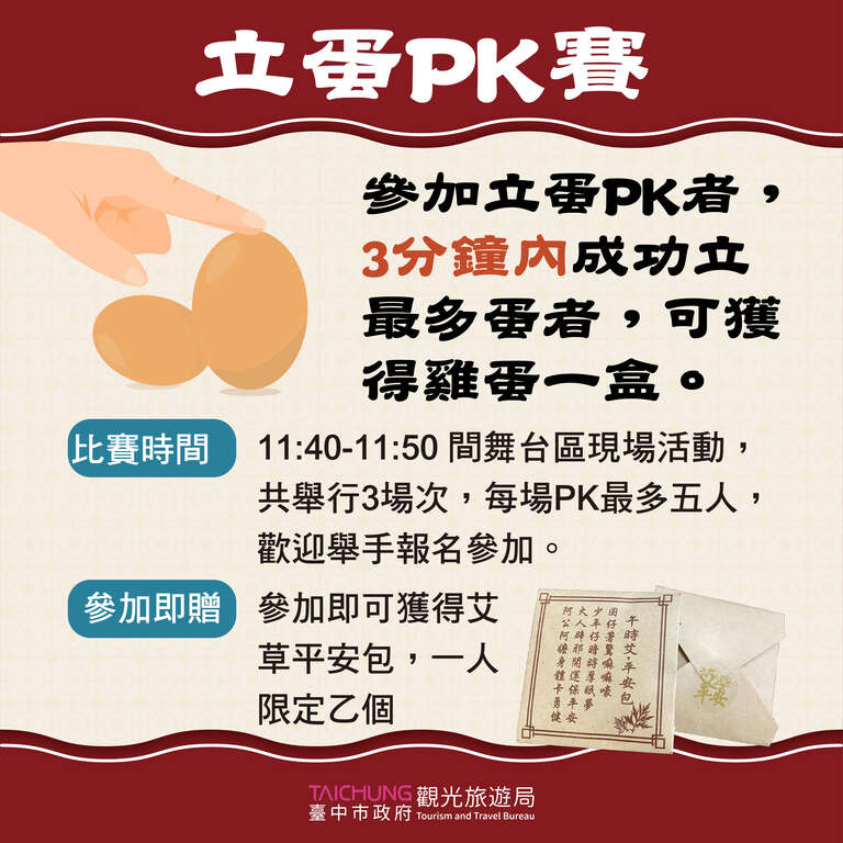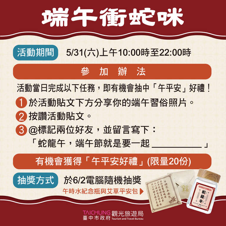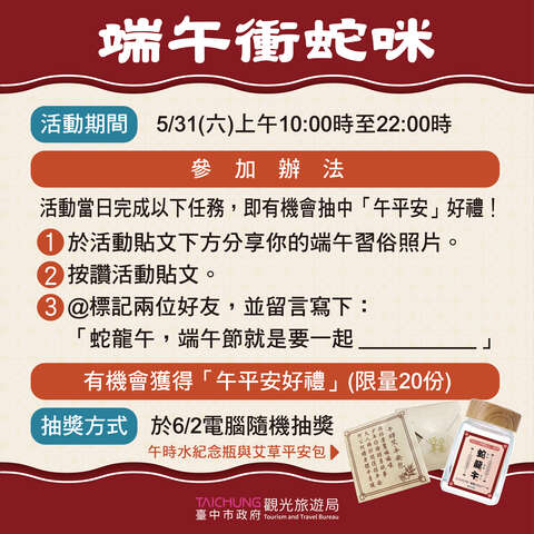 台中市风景区管理所补充,当天无法亲临现场的朋友也可以透过线上活动,参加「分享照片抽『午平安』好礼」,线上活动讯息将会发布在「台中市风景区管理所」官方脸书上,只要在活动期限内於贴文下方分享你体验端午习俗的照片,就有机会把限量20份的午时水纪念瓶与艾草平安包抽回家,端午节当天上午10时记得关注「台中市风景区管理所」脸书粉专一起同乐!更多好玩好吃的旅游资讯请上台中观光旅游网、大玩台中脸书及台中市风景区管理所脸书查询。