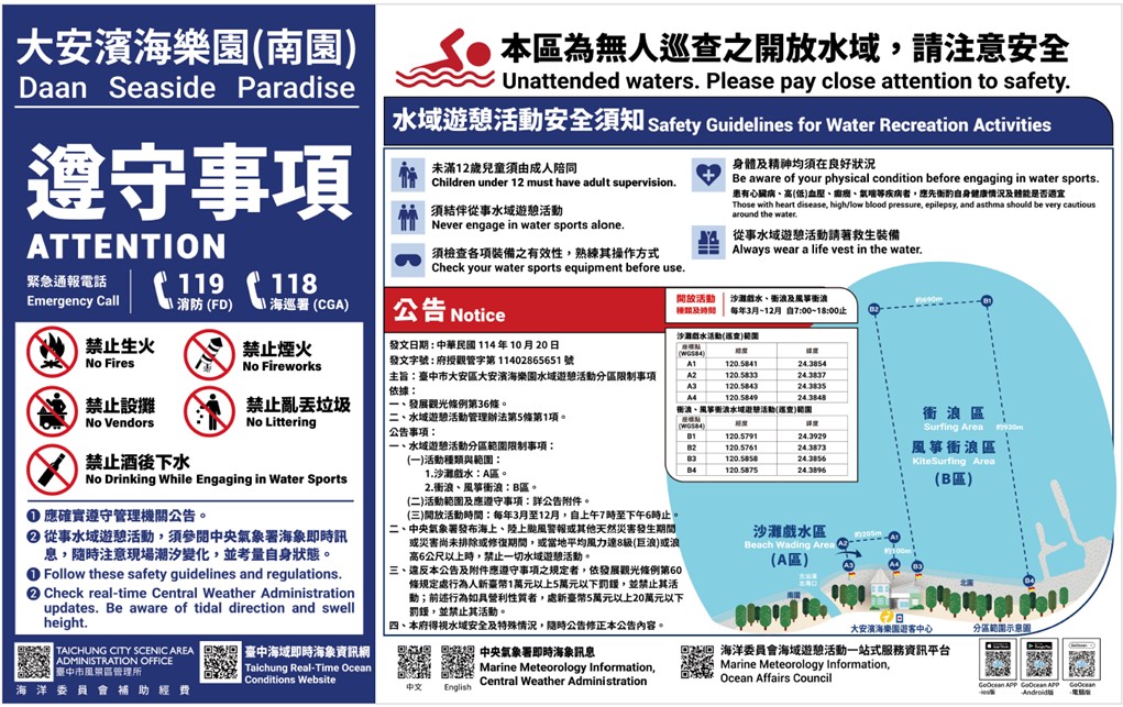 观旅局长陈美秀指出,市府配合行政院「向海致敬」政策,持续推动民众「知海、近海、进海」,并於去(114)年10月20日公告大安滨海乐园海域转型为「开放式水域」,透过制度完善与安全配套,让亲海活动更加自由也更有保障。为让民众安心亲海、放心戏水,市府建置「台中海域即时海象」资讯系统,提供民众更即时的海象资讯以评估因应戏水安全。