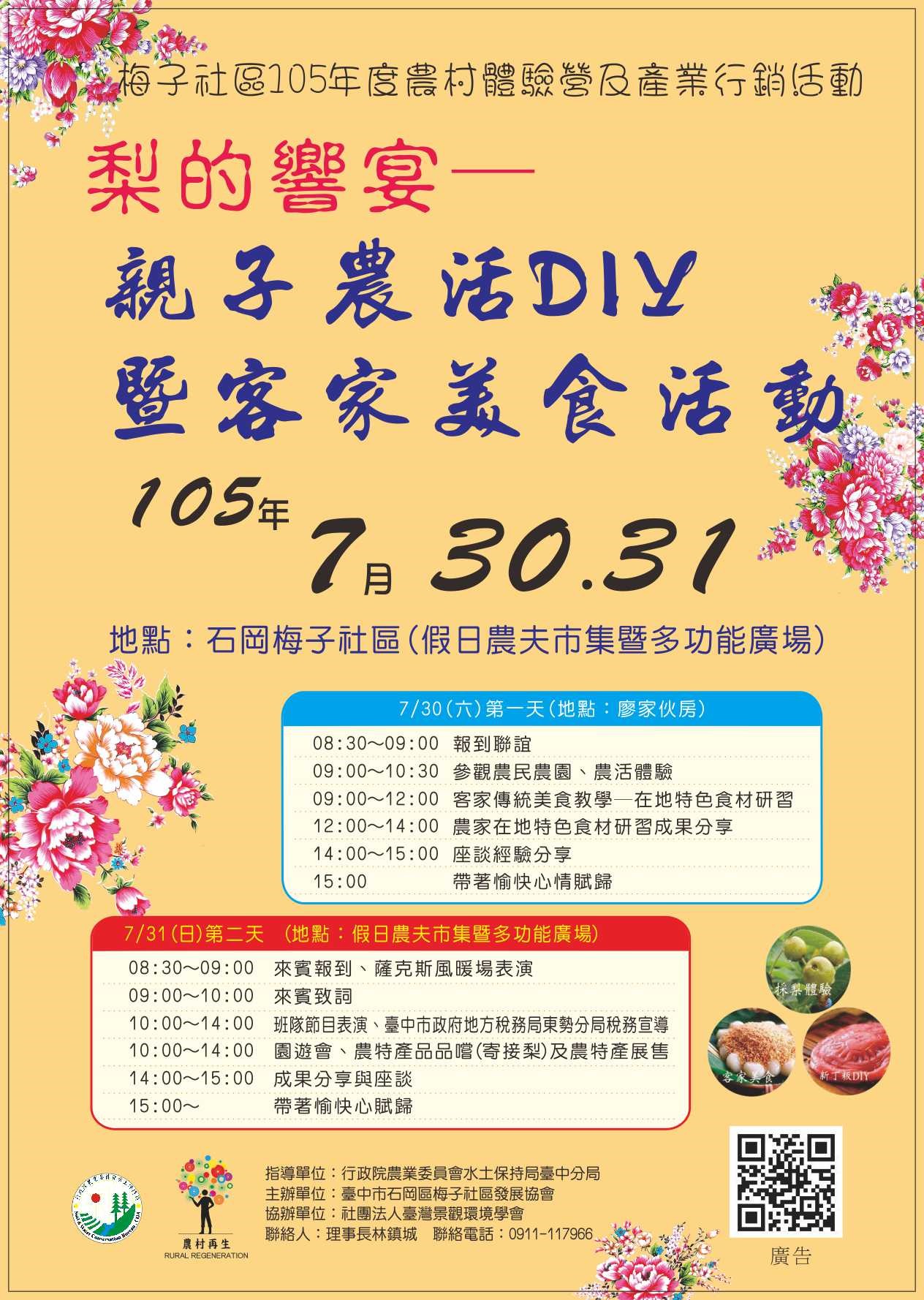 本市石冈区梅子社区发展协会於105年7月30、31日(星期六、日)上午8点30分到下午3点分别在梅子社区廖家伙房及假日农夫市集暨多功能广场(东丰自行车绿廊旁,近石冈幼儿园梅子分校)举办「梨的飨宴-亲子农活DIY暨客家美食活动」,社区协会规划了一系列活动,并邀请邻近农再社区(松鹤、中和、庆福、庆东、龙兴)共同参与,展现在地产业的丰富多样性。