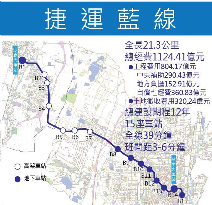 大台中轨道路网第二条捷运诞生,交通部昨(21)日召开台中捷运蓝线计画复审会议,正式核准台中市政府的提案,修正後转陈行政院审议。未来捷运蓝线完成後,预计服务活动人口达57.6万人,运量能达每日23.06万人,尖峰运量可达每小时3.91万人,将改善台湾大道输运,并串联市中心及双港副都心,活络沿线产业发展,也将与目前正在加紧施工的中捷绿线、台铁山线及海线车站共站串联。