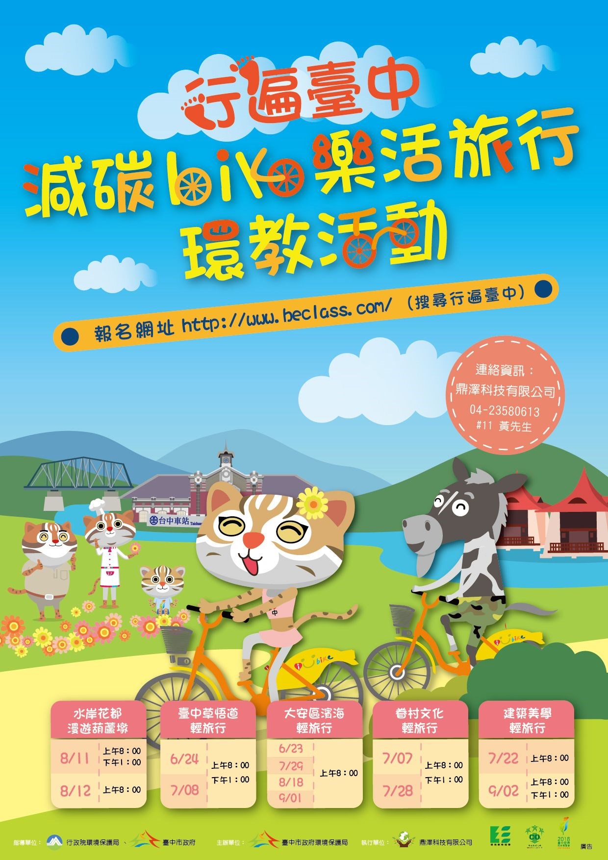 第二波「行遍台中减碳乐活轻旅行」活动来罗!精选「台中草悟道轻旅行」、「大安滨海生态之旅」、「老眷村新生命,游读阿罩雾」、「台中建筑美学之旅-认识绿建筑」等四条低碳轻旅行路线,邀请在地专家学者担任导览讲解老师,让民众避开夏日酷暑,一窥台中知名景点的历史风华与自然生态环境,即日起开放网路报名,欢迎踊跃参加。