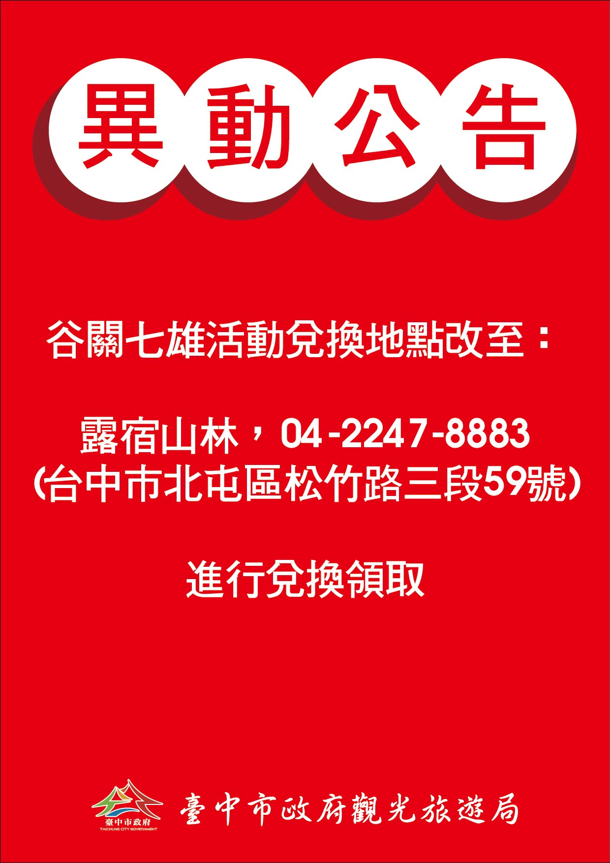 因店家迁移问题,7/1之兑换仍於露宿山林店现址(台中市北屯区松竹路三段59号)办理。