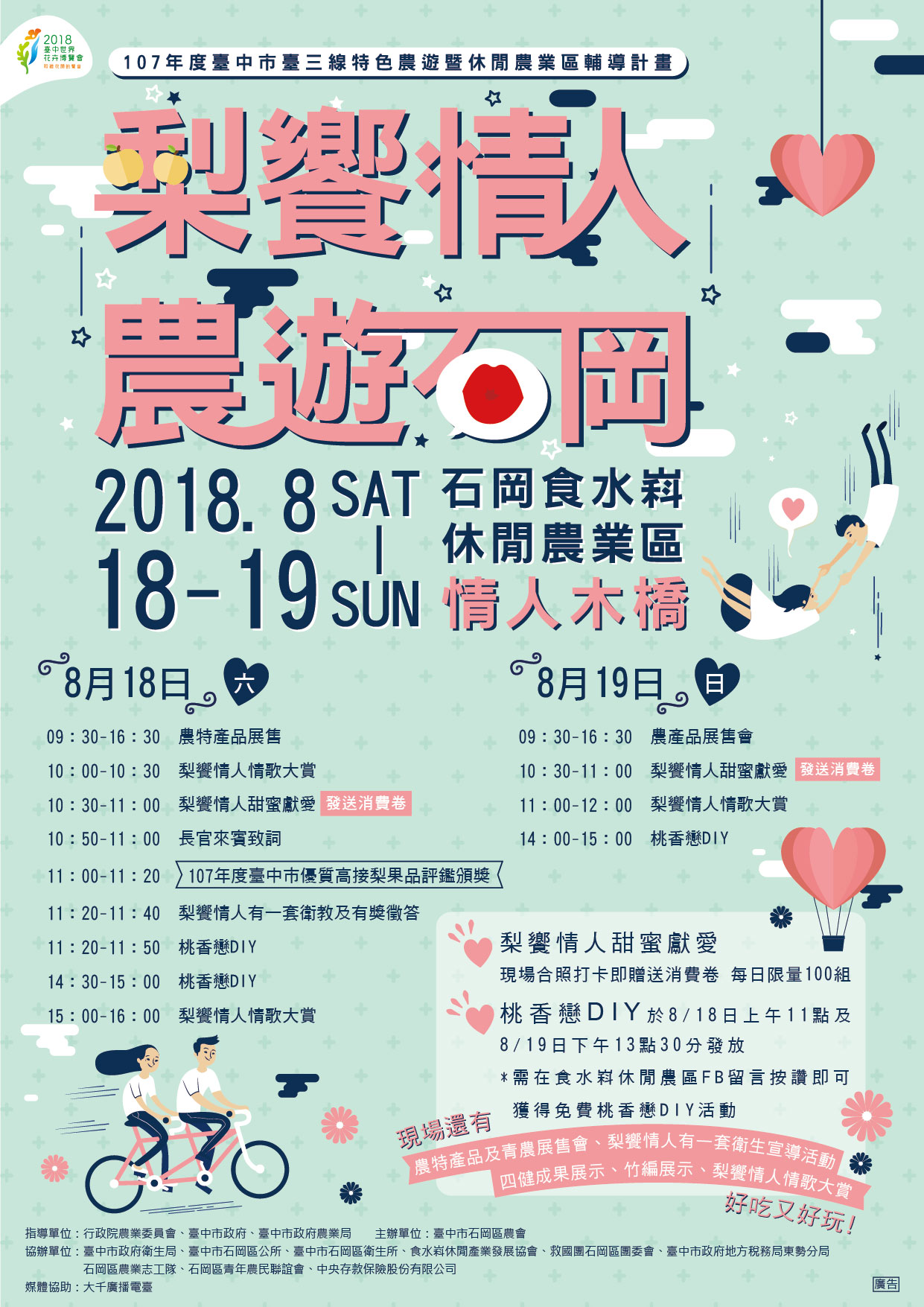农业局指出,石冈食水嵙休闲农业区,以有着欧洲风情的石农咖棑馆、情人木桥及自行车绿色旅行闻名,而每年的七夕情人节也适逢当地农产-梨子的产季,8/18也将进行台中市质高接梨果品评监奖,藉着办理活动,除了推广石冈在地的旅游景点外,也可推销当地当季的农特产品,让游客感受食水嵙不同的农村风情,享用在地养生的鲜菇养生锅,体验农游石冈的风情与浪漫,邀请大家一同前往体验梨飨情人的农游甜蜜滋味。