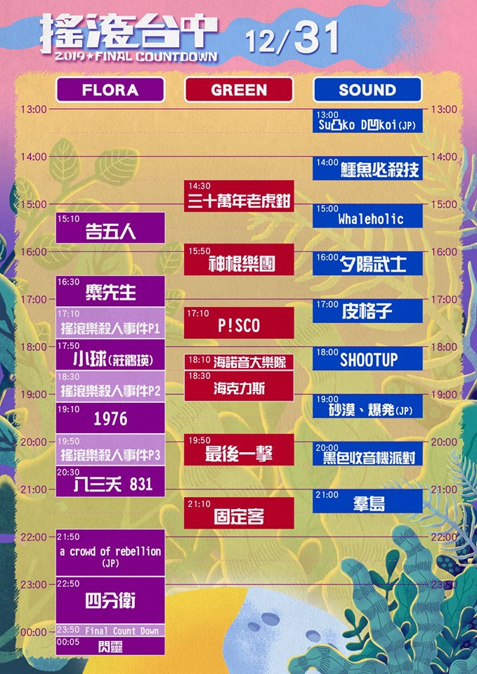 灭火器、告五人、Su凸ko D凹koi (JP)、Broken By The Scream (JP)、929、四分卫、记号士、马克白、1976、怕胖团、三十万年老虎钳、a crowd of rebellion (JP) 、a crowd of rebellion (JP) 、庄鹃瑛(小球)、神奇胶 (港)、PAP YEAHH (泰)、Manhole New World (日)、麋先生、老王乐队、MONNI (KR)、 FNGDY 疯笛(MY)、八三夭 831 ...等。