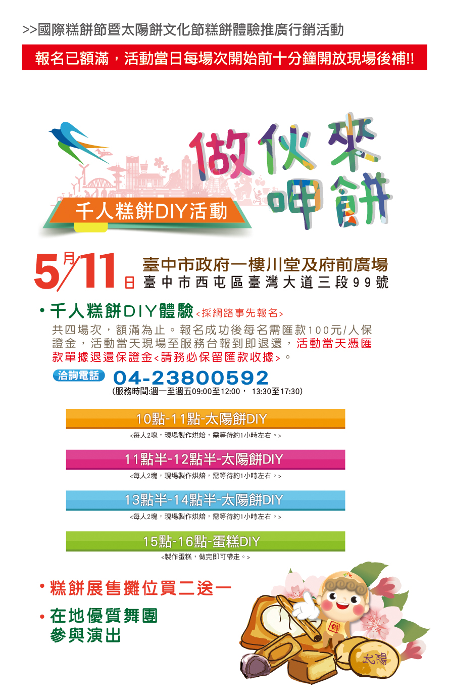 另外,5月11日在台湾大道市政大楼举办台中糕饼节千人体验活动,除安排千人糕饼DIY,现场还有糕饼展售摊位买二送一优惠,欢迎参加! 这周末还有许多展览、讲座、活动等,更多资讯请见「中市周末活动看板表格0511-0512」。