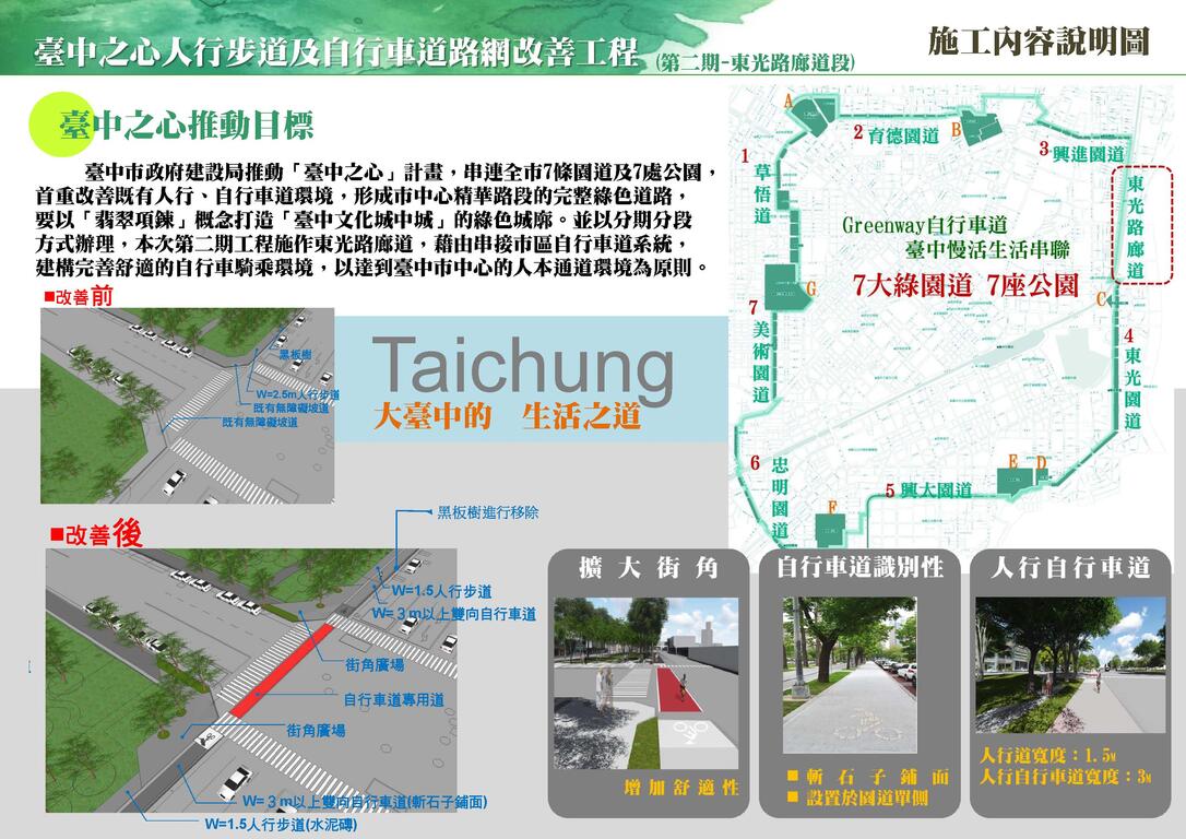 此工程改善内容,包括人行道、自行车道、街角广场及景观改善,日前建设局已办理地方说明会,向在地民众说明台中之心绿园道的自行车道串联计画。