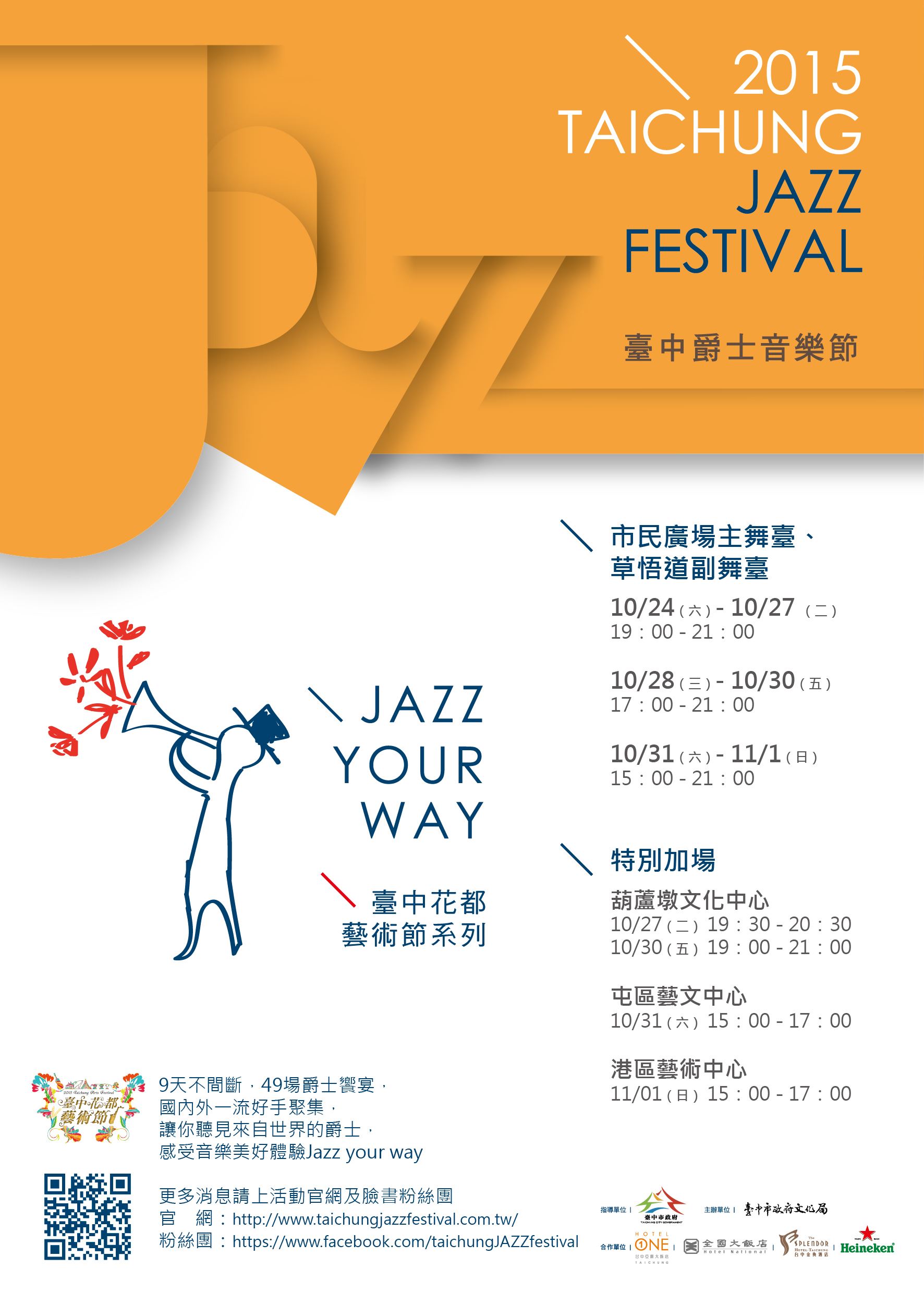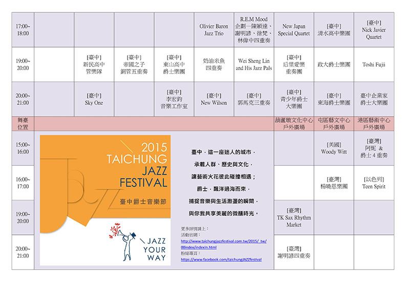 台中的秋天是爵士之秋,爵士摇摆轻松的浪漫因子漂浮在城市的每一个角落,除了乐迷熟知的市民广场、草悟道舞台以外,更增加了葫芦墩艺文中心、屯区艺文中心、港区艺术中心三个副场地,让整个大台中地区都沉浸在爵士音乐节的节庆氛围当中。