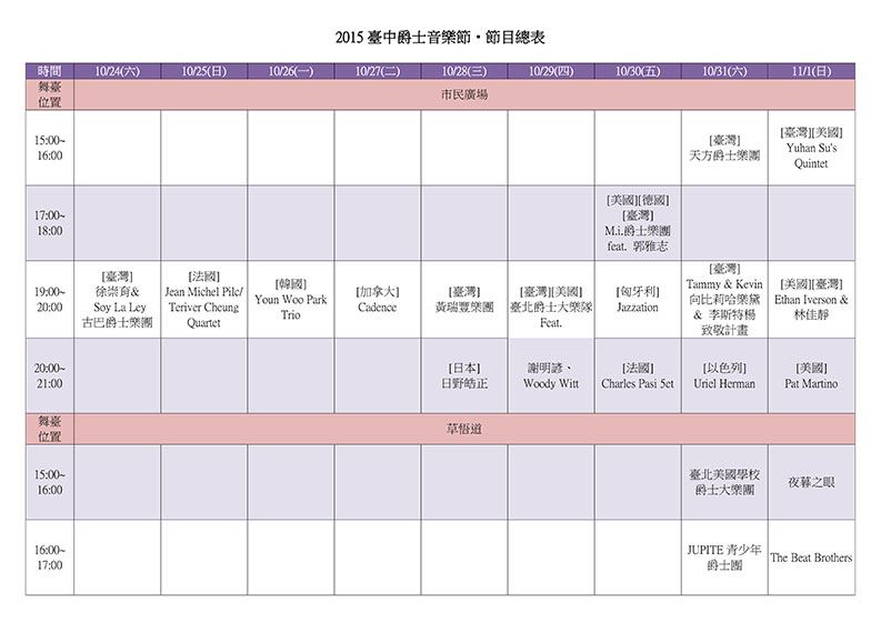 台中爵士音乐节已连续举办12年,每年一到10月份,偌大的市民广场就涌进成千上万的乐迷及观光人潮。今年活动将於10月24日至11月1日,继续在市民广场及草悟道登场,大、小舞台共计邀请12支国际团队、22支台湾团队及15支台中的在地团队演出,现场还有丰富多元的异国美食及文创摊位;另一方面,延伸花都艺术节的理念,活动期间在葫芦墩文化中心、屯区艺文中心及港区艺术中心等3座文化中心户外广场各有一场演出,市民朋友可以就近前往参加,享受爵士音乐悠闲惬意的氛围。