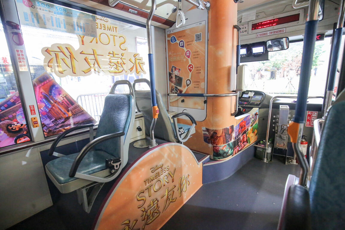 交通局长叶昭甫表示,为鼓励民众搭乘大众运具,市府积极争取迪士尼彩绘双节公车,车厢内外可见到狮子王、玩具总动员、小美人鱼、小飞象、无敌破坏王等迪士尼卡通人物,这辆迪士尼公车即日起至年底将不定时行驶於台中市公车300、309及310路,8月17日、24日下午3时至4时更将分别於台中车站(东站)、高美风车大道(18号风车)快闪现身,民众可进入车厢内体验、拍照打卡,欢迎带着迪士尼玩偶来同乐。