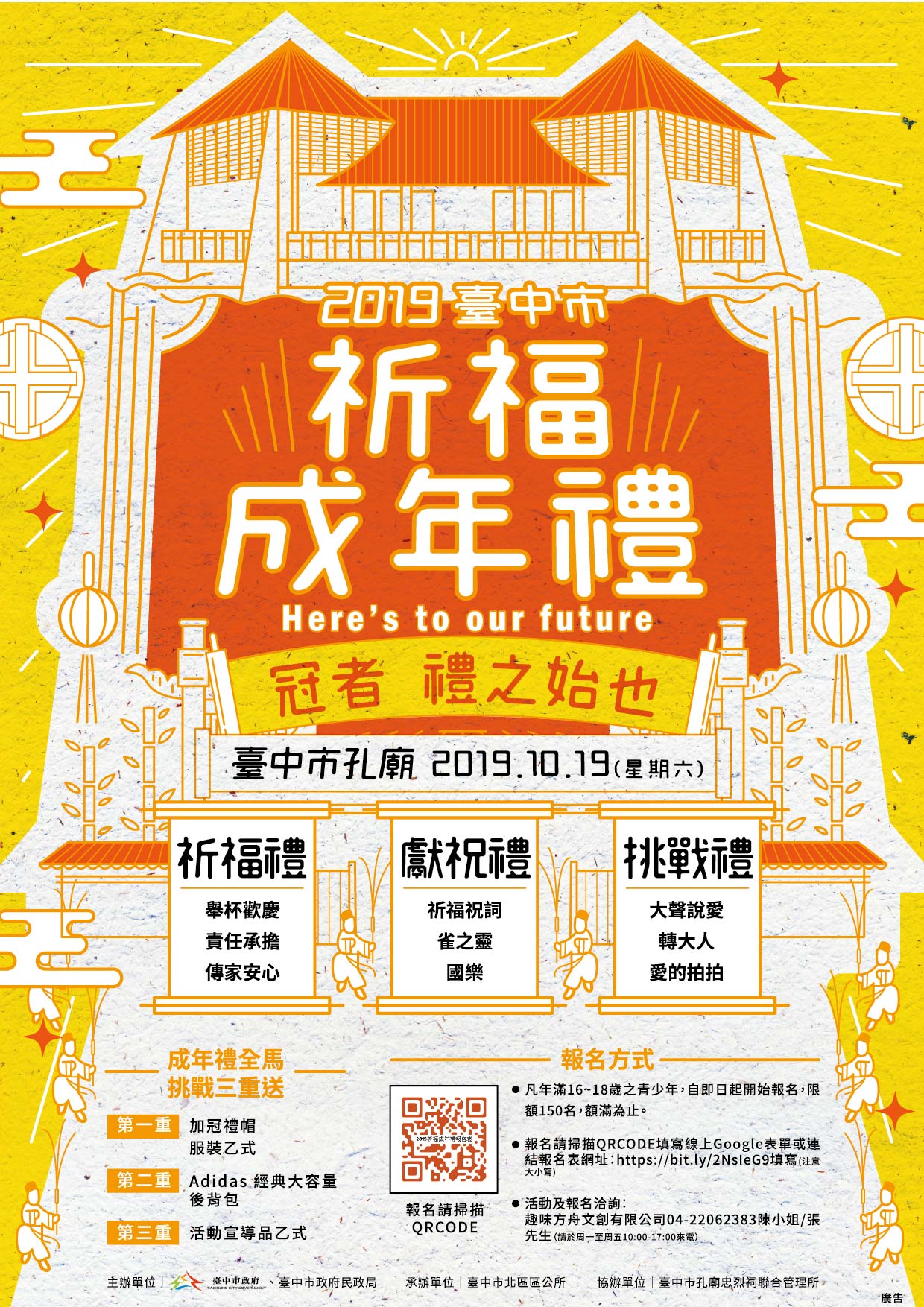 活动内容:本次成年礼邀请150对16至18岁学子与其亲属共同参与盛会,以「举杯欢庆」庆祝成年,背上责任背包象徵「责任承担」,透过「传家宝·安心符」传递承诺并且献上祝福,另外还有三关挑战赛以增进亲子感情,参加本活动之学生可获得好礼三重送!数量有限,欢迎踊跃报名参加。