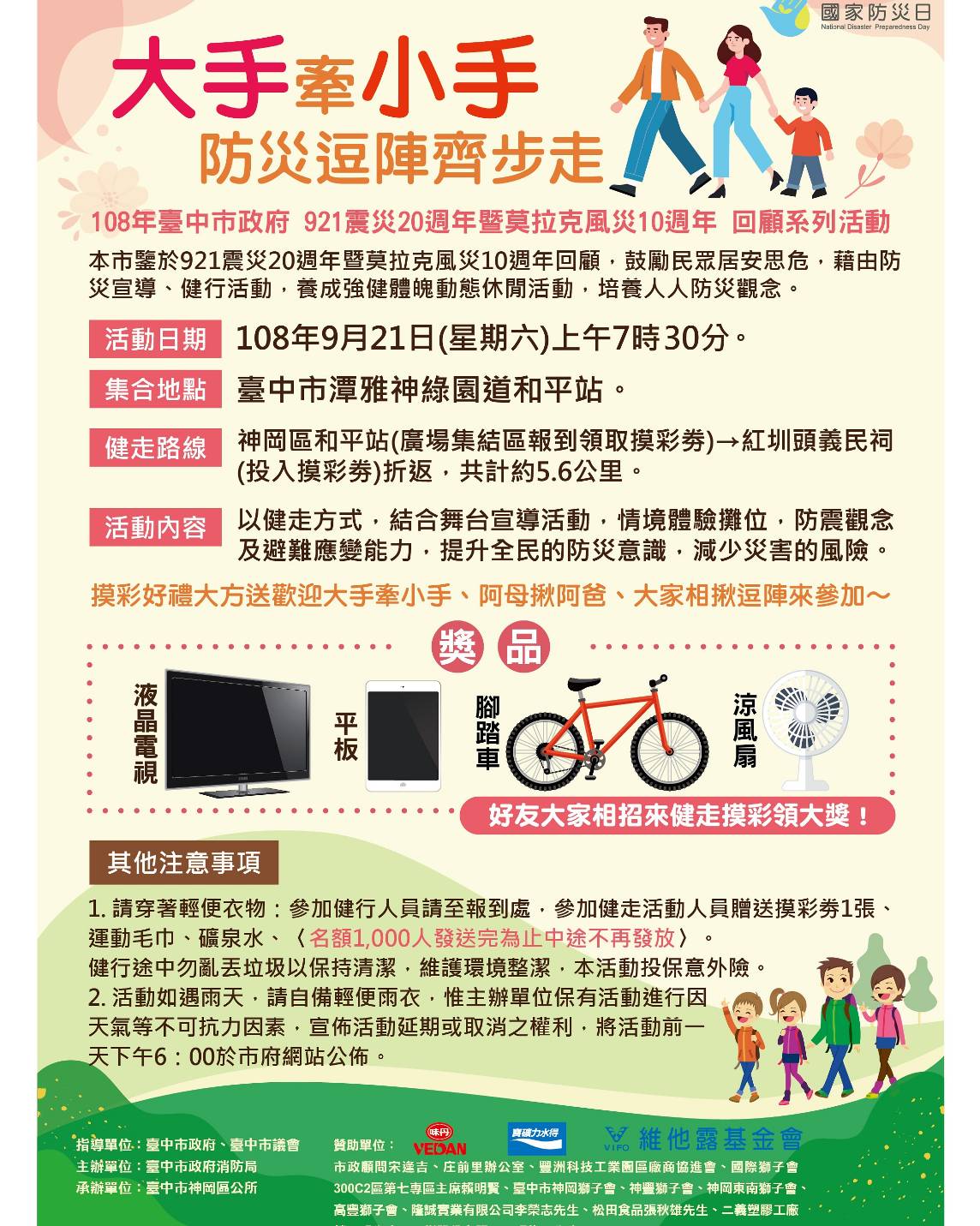 今年921地震满20年,为强化台中市区级灾害应变能力,结合108年国家防灾日互动式体验系列活动,引领国人回顾灾害历史,於9月21日将於神冈区潭雅神绿园道和平站办理「921大手牵小手、逗阵防灾齐步走」活动,藉由全民健走活动,凝聚人与人之间情谊,并宣导地震防灾观念,提升全民防灾意识。