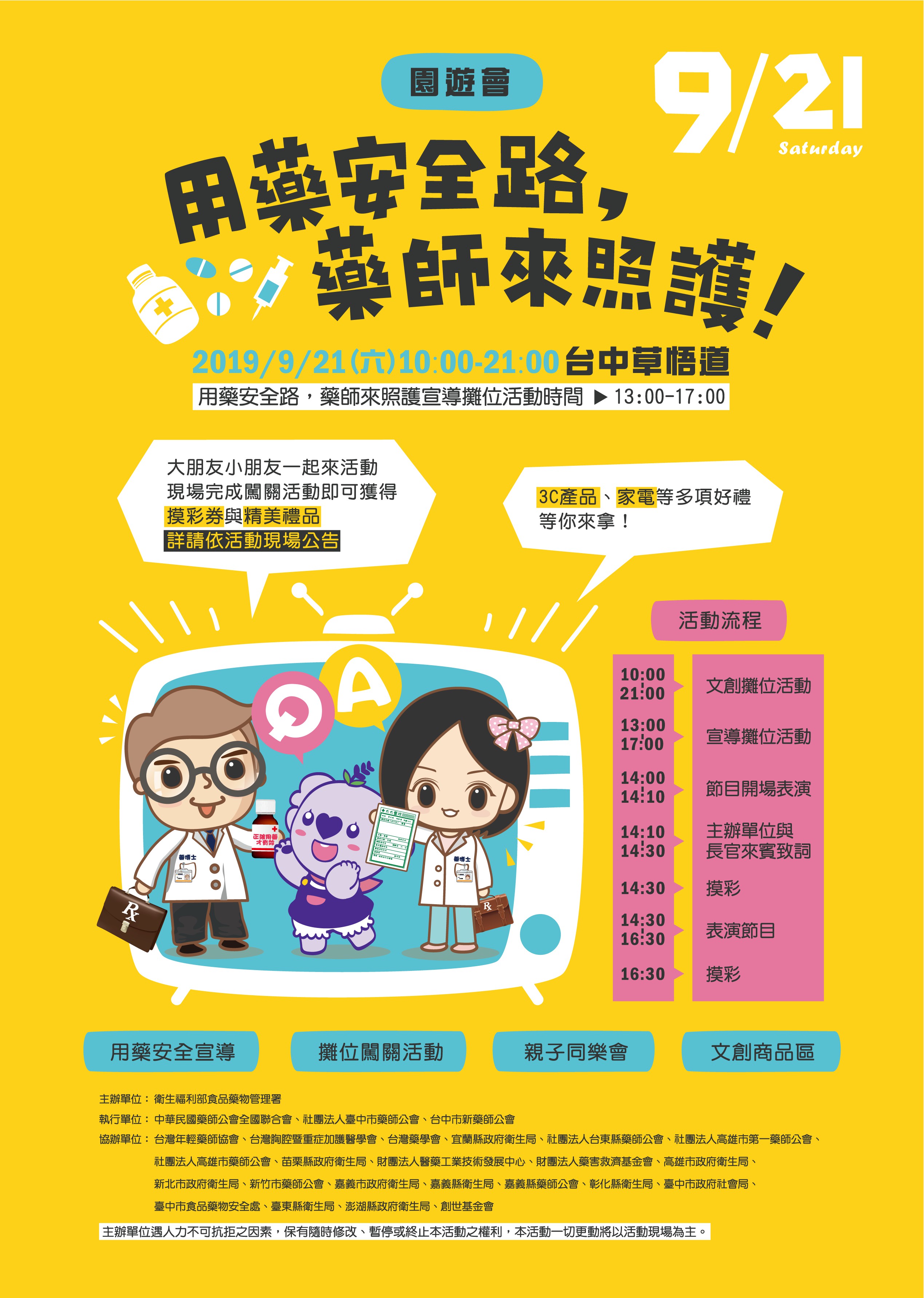 由卫生部食药署举办的用药安全路 药师来照护 园游会将在本周六於草悟道登场,活动当天现场将安排摸彩、闯关游戏、用药宣导以及文创商品区,希望藉由活动传递给民众用药的安全性。