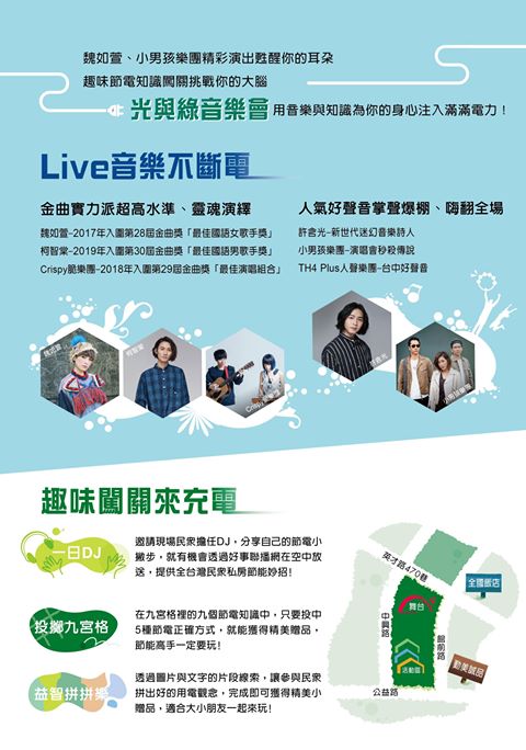特邀魏如萱、小男孩乐团、柯智棠等超人气实力派歌手、独立乐团一起节电摇摆就算省电,也能为你的生活供给满满能量!现场还有趣味的节电知识闯关,欢迎来挑战!