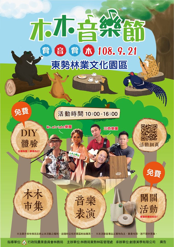 东势林业文化园区九月的嘉年华活动以源自於森林的木制乐器为主题,特别邀请了歌声扣人心弦的「Mr.Alright」与旋律温暖动人的「三奇乐团」为大家献上美妙动听的森林音乐会!