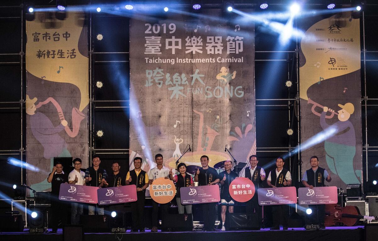 2019台中乐器节今(5)、明两日在市民广场与草悟道登场,今晚邀请德国钢琴手Julian Moreen、义大利萨克斯风手Claudio Jr De Rosa、圣露西亚吉他手Ronald Boo Hinkson等坚强阵容抢先登场,迷人节奏与旋律,吸引许多民众到场狂欢,副市长杨琼璎也共襄盛举,跟着节奏摇摆,High翻一整夜。