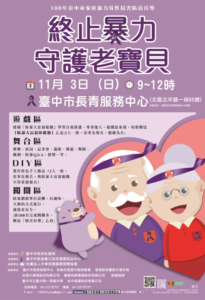 为了凝聚 29 区市民及防暴网络的能量、为让老人福利服务机构、防暴团体及 人士有展现防暴能量的舞台,也拓展防暴规划师宣讲服务的领域。今年度活动宣导主轴将着重在老人保护的议题上,因此邀请大台中市 29 区的 社区关怀据点、老人机构,如社区关怀据点、志工或老人养护中心、照顾机构或长 照 ABC 站…等,共同加入防暴的行列。