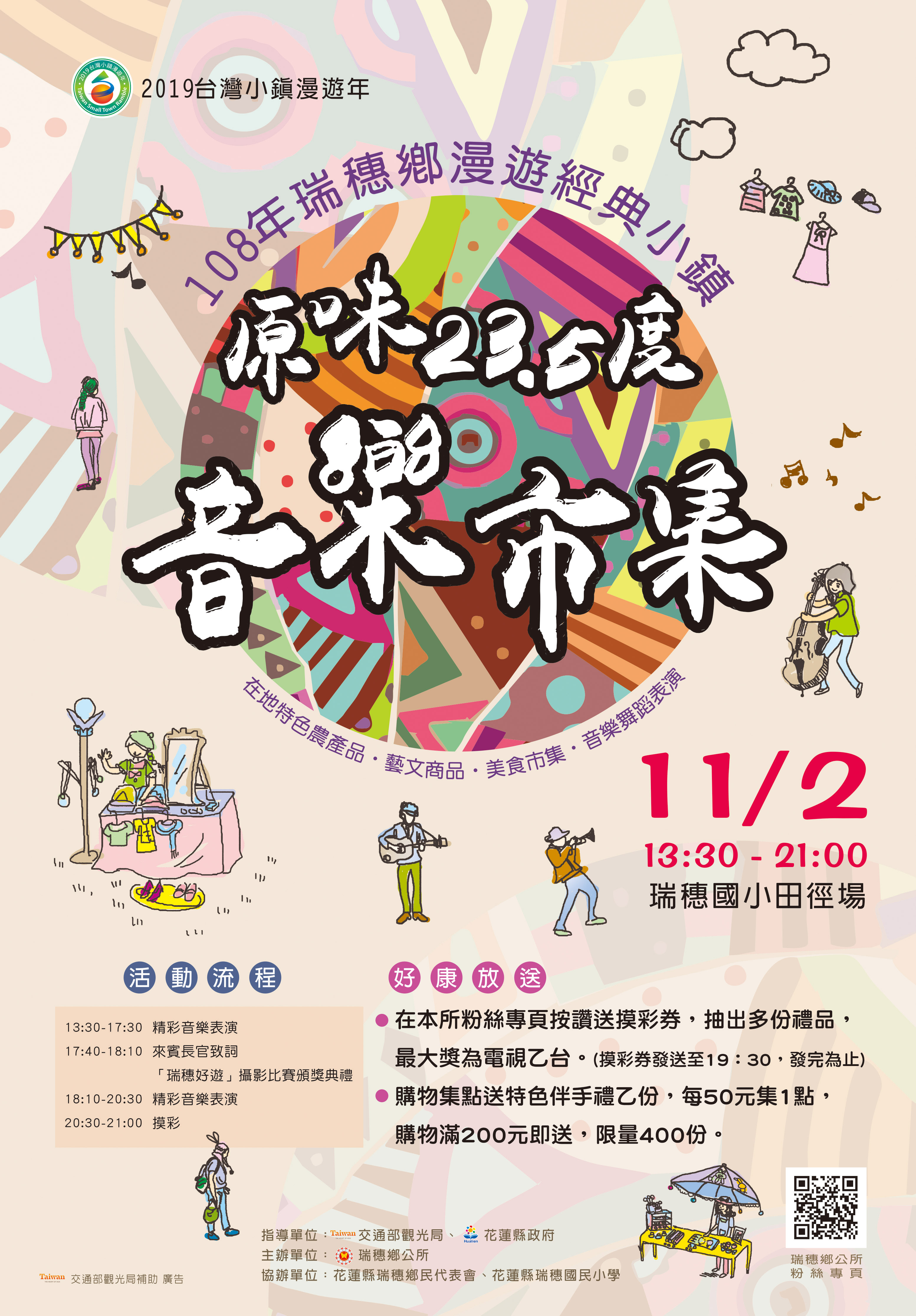 案系花莲县瑞穗乡公所为办理「108年瑞穗乡漫游经典小镇原味23.5度音乐市集」,请本局协助宣传。11/2当天13:30-21:00於瑞穗国小田径场,将有原味23.5度音乐市集相关活动。 当地将有在地特色农产品、艺文商品、美食市集与音乐舞蹈表演等。相关照片