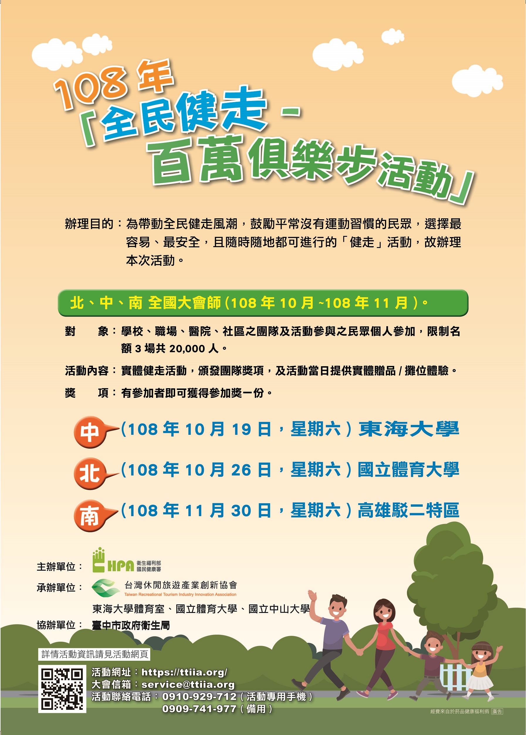 由国民健康署与台中市政府卫生局举办的「108年全民健走─百万俱乐步活动」即将在明(19)日於东海大学田径场开走!卫生局今日特别「真人开箱」健走「家私(工具的台语)」,提醒民众记得带水、帽子,穿着浅色透气排汗运动衣与裤子、运动鞋,并做好防晒措施。