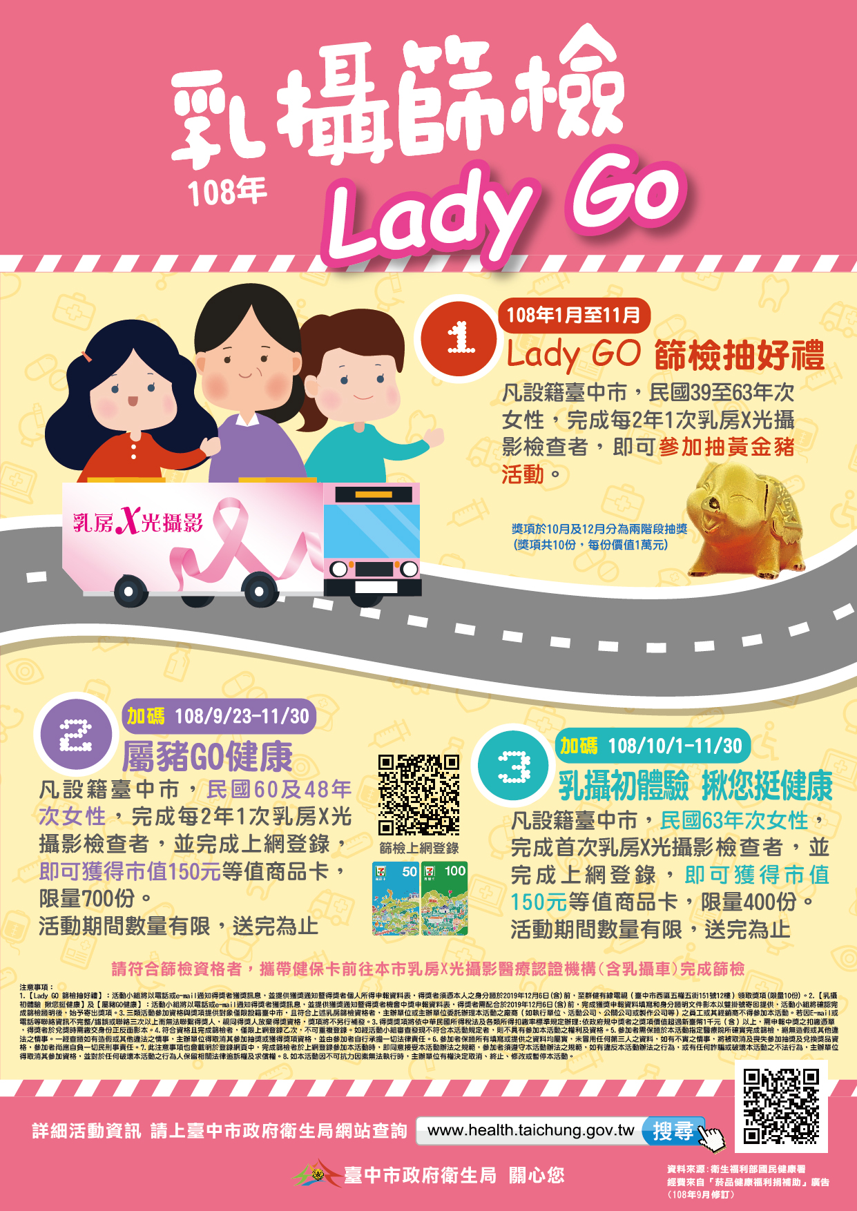 卫生局长曾梓展呼吁,要预防癌症,定期筛检很重要,45至69岁女性每2年要做1次乳房X光摄影检查,尚未做检查的女性朋友可与家人一起参加活动,当日完成筛检者,可获200元家乐福礼券、1.5公斤好米及抽奖资格,若为设籍台中市的市民,卫生局再加值赠送150元商品卡礼券,还有机会将「万元黄金猪」带回家。