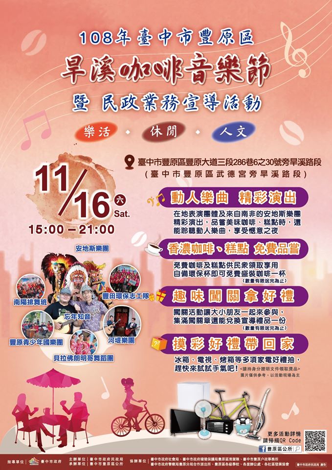 本周六下午三点开始,将在丰原区武德宫旁举办旱溪音乐咖啡节,除了有动人乐曲演出以外,现场更有香浓咖啡以及甜点免费品尝。当天更有趣味闯关、摸彩等活动,欢迎民众一起共襄盛举!