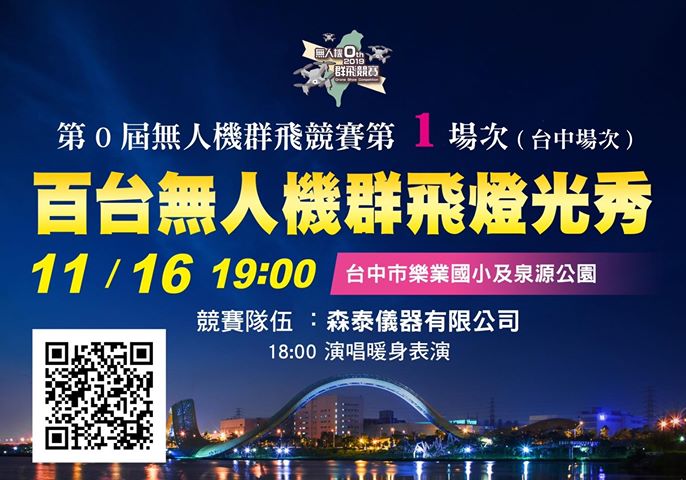 此次竞赛分为A组及B组,A组为100台(含)以上之群飞邀请赛,参赛队伍包含森泰仪器等共五队,分别於全台五个地点演出,并由森泰仪器团队於11/16台中市乐业国小拉开帷幕。