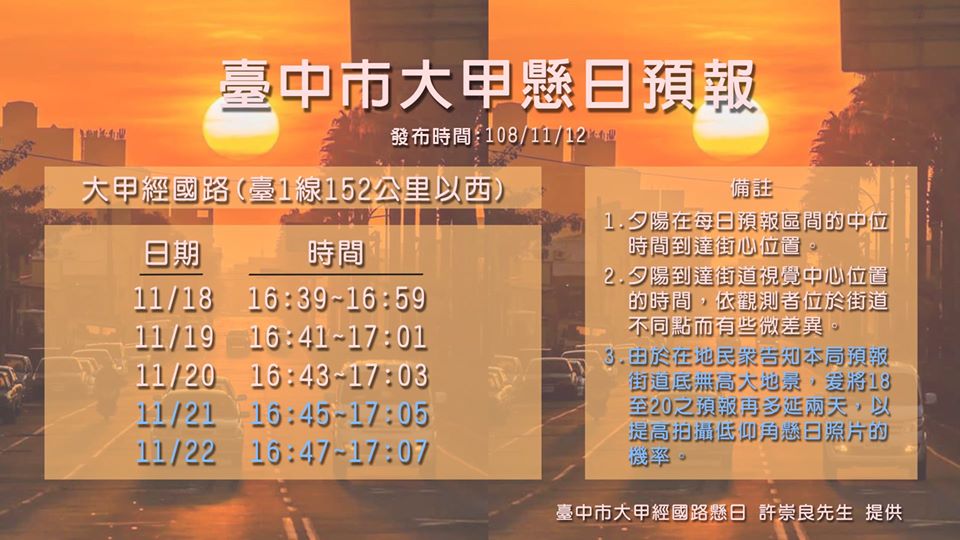 台中市悬日又来啦!这次悬日将在台中市大甲区经国路 (台1线152公里以西)於11/18-22的傍晚,在无云遮下将可观看到悬日景象。在此也提醒要前往欣赏悬日的民众,出发前请查看天气预报,久视悬日请配戴太阳眼镜,於街道观赏请遵守秩序和维持自身交通安全,避免推挤受伤喔!