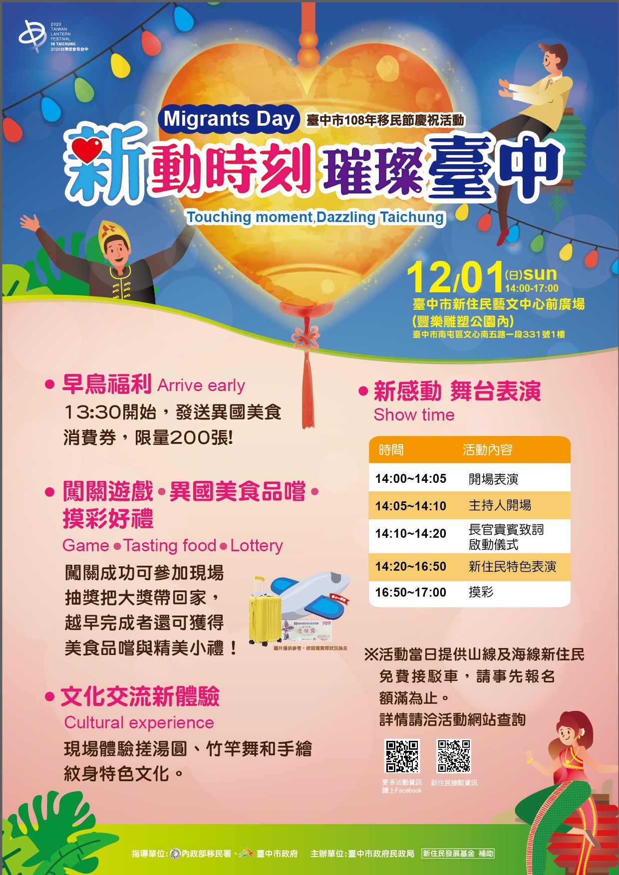 活动时间:108年12月1日(星期日)下午2时至5时活动地点:新住民艺文中心前广场(丰乐雕塑公园内)举办新住民特色文化表演、街头艺人、美食飨宴及闯关摸彩活动,并结合2020台湾灯会新住民灯区花灯元素,现场开放新住民亲子共同手作花灯,其作品将於灯会期间在新住民灯区公开展示相关照片