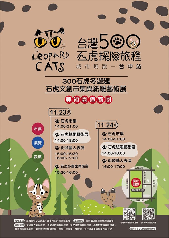 本周末11/23、24两天,在美术园道商圈,将举行台湾石虎旅程 - 城市现踪活动。现场将有石虎相关的文创市集以及纸雕艺术展,透过活动提升民众对於石虎更进一步认识。当天也将邀请街头艺人进行精彩表演喔!