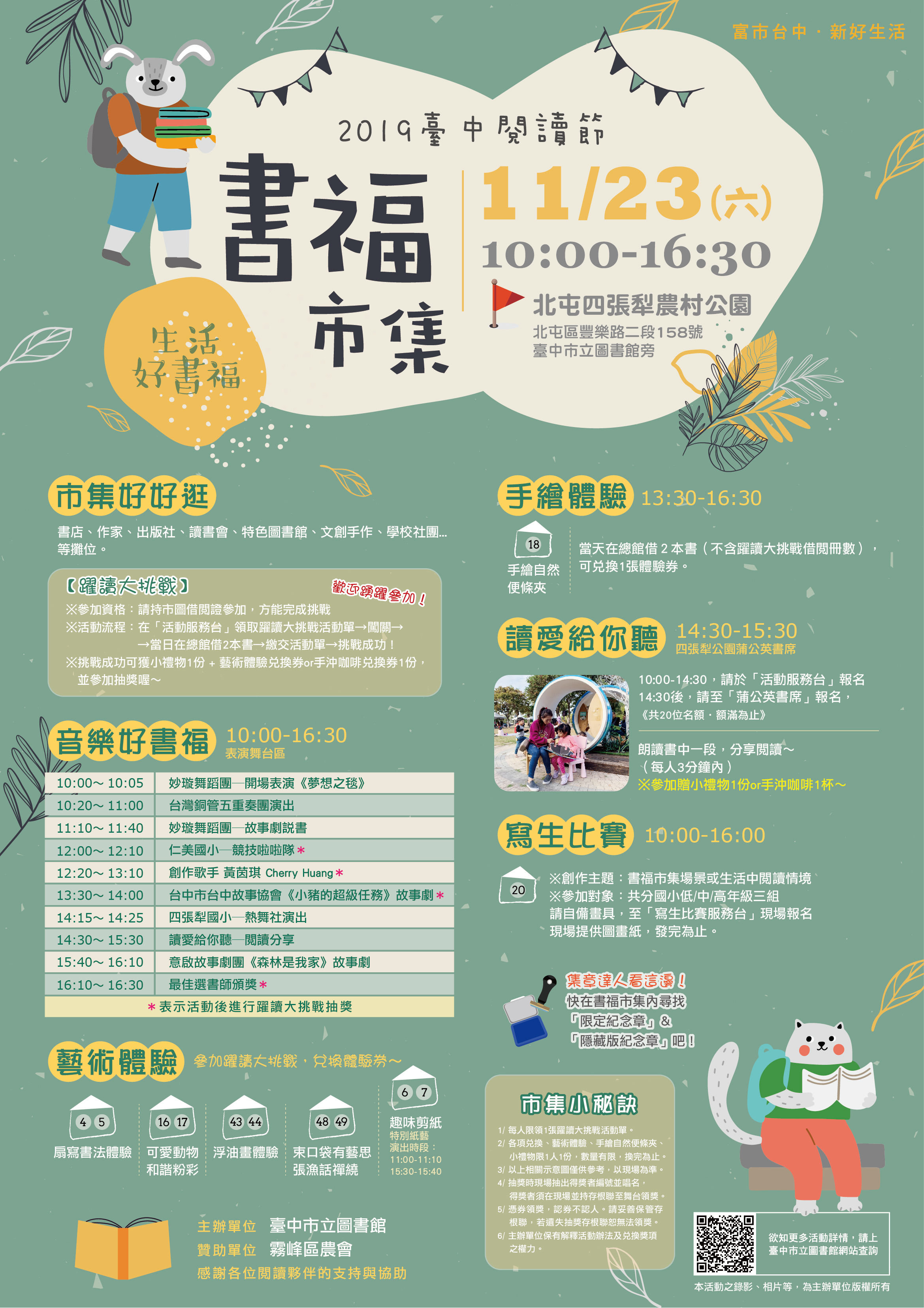 除了趣味剪纸、可爱动物和谐粉彩、浮油画、缠绕画束口袋、扇写书法等艺术体验,并邀请台中市台中故事协会演出故事剧、妙璇舞蹈团的说书结合舞蹈与阅读,各摊位演绎多采多姿的阅读风景,欢迎一起来感受