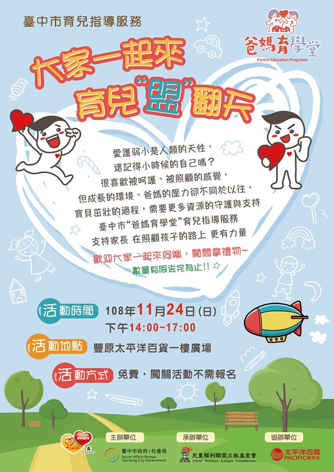 11/24在丰原太平洋百货,将由台中市育儿指导服务 - 爸妈育学堂与各位爸爸妈妈分享育儿指导的一些心得以及技巧,活动当天现场将有闯关活动,欢迎大家一同来挑战拿礼物喔!