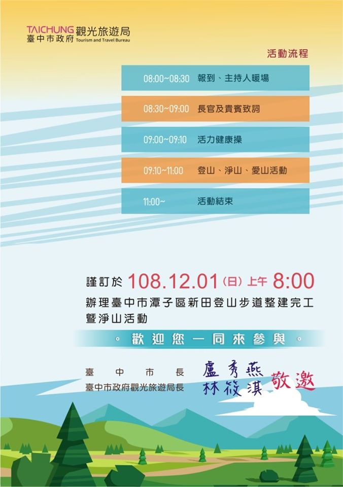 本周日(12/1)台中市潭子区新田登山步道将举办「新田登山步道整建完工暨净山活动」~当天我们将会发放清洁工具供大家一起净山,以实际行动来爱护我们优美的步道环境,出发前我们还有专业的老师一起带动健康操来活动大家的筋骨。参加我们净山活动的民众,前150名完成的参加者,还能获得我们精美的礼品唷!