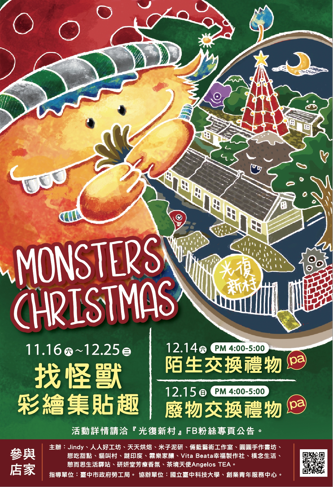 迎接2020台湾灯会并庆祝圣诞节,光复新村青创基地变身「怪兽圣诞村」,创业青年在村子里点亮梦想圣诞树,即日至12月25日推出「找怪兽 彩绘集贴趣」活动,游客可以在村内活动店家找到各具店家特色的怪兽贴纸,活动期间集满10张贴纸,即可兑换限量摘星环保提袋1个,欢迎前往雾峰光复新村找怪兽、集怪兽,度过欢乐圣诞节。