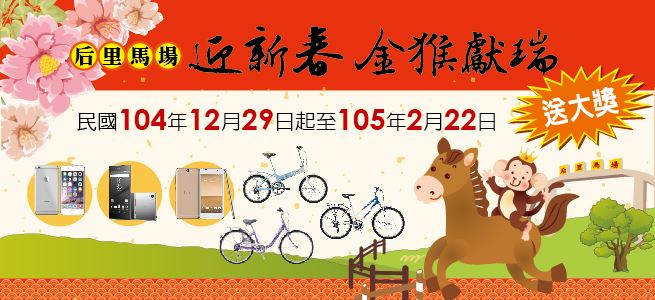 迎接105年猴年,后里马场今年推出「金猴献瑞送大奖」活动,凡今年12月29日起至105年2月22日(元宵节)止,民众到后里马场购入园门票1张,即赠送摸彩券1张,奖品丰富,包括智慧型手机、高级折叠式自行车等。活动结束後,台中市政府观光旅游局将在於阳明市政大楼公开抽奖,并於官网公布得奖者名单。