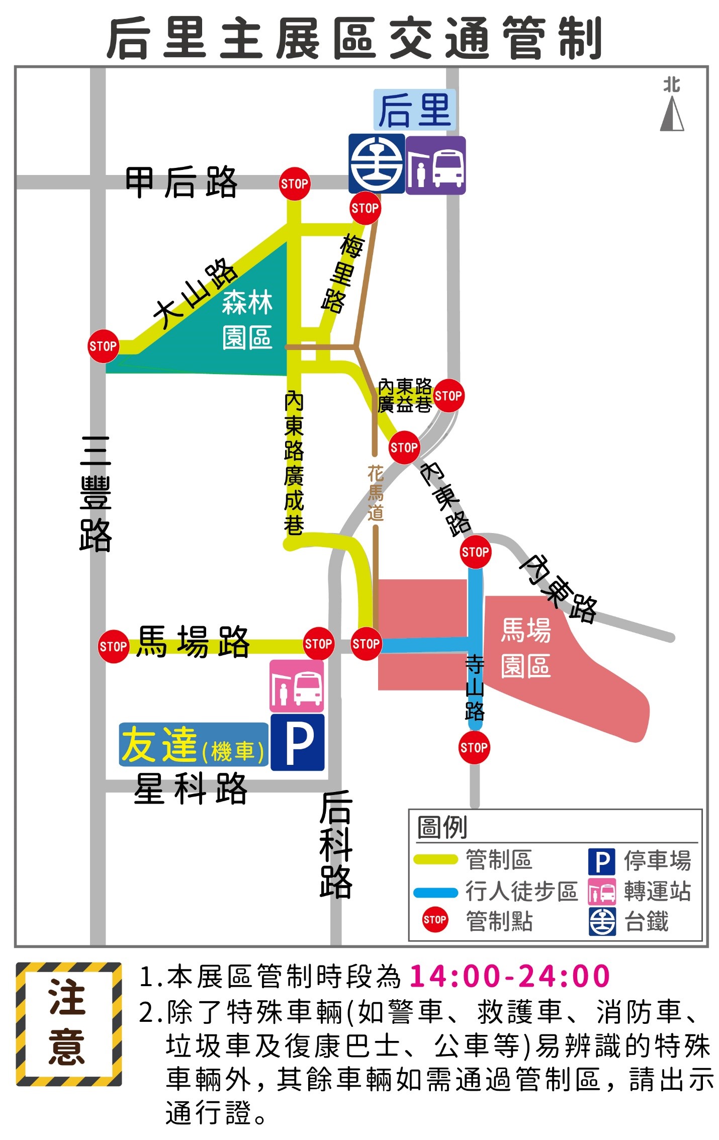 主展区包括森林园区、马场园区及花马道等周边道路全天启动交通管制,除公车、接驳车、计程车及有证车辆,其余车辆禁止通行。马场路(三丰路-后科路)、大山路(三丰路-内东路)、内东路(甲后路-后科桥下)、梅里路(甲后路-内东路)、内东路广成巷(内东路-马场路)及内东路广益巷(内东路-后科路)等路段,管制时间为每日14时至24时、周六及周日为10时至24时。