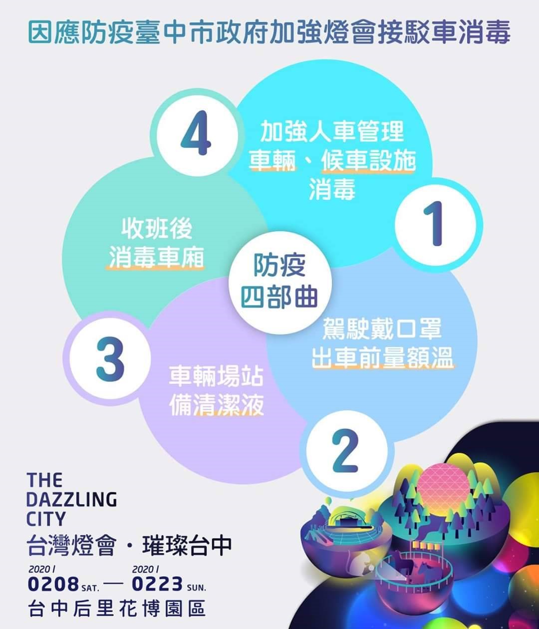 交通局长叶昭甫表示,因应武汉肺炎,市府针对灯会接驳车服务人员进行健康管理,实施车辆与候车设施每日消毒、驾驶出车前量额温并载口罩、车辆场站备清洁液、收班後消毒车厢、接驳站张贴防疫资讯等防疫措施。感谢民众配合市府相关检疫措施,面对未来两周的疏运挑战,市府将更审慎应对,让民众安心搭接驳车前往园区赏灯。