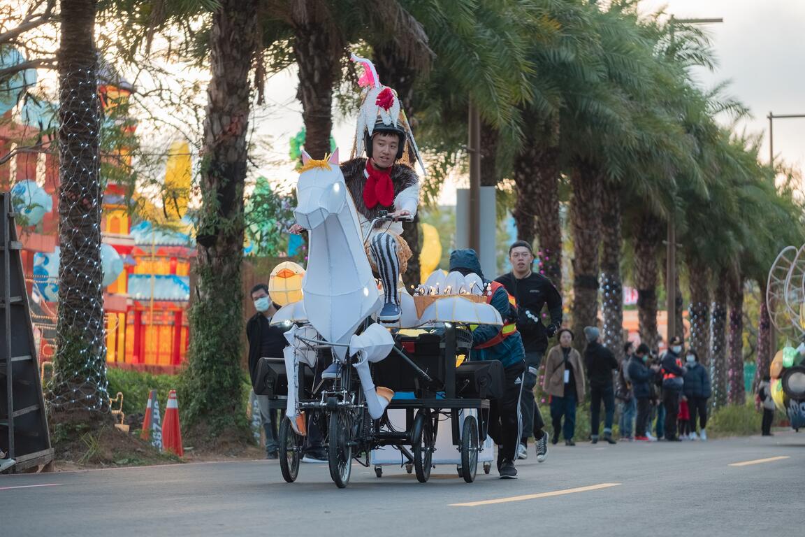 2020台湾灯会佳评如潮,吸引各地民众参观,其中后里马场园区由新媒体艺术策划团队「噪咖事务所」,结合艺术与科技打造夜光游行车「宝岛炫光巡逻队」,每天下午3时及5时在马场路登场,融入台中鸡排、珍奶、爵士音乐节等特色,搭配专业演员动感表演,KUSO又逗趣的演出,让民众惊喜连连。