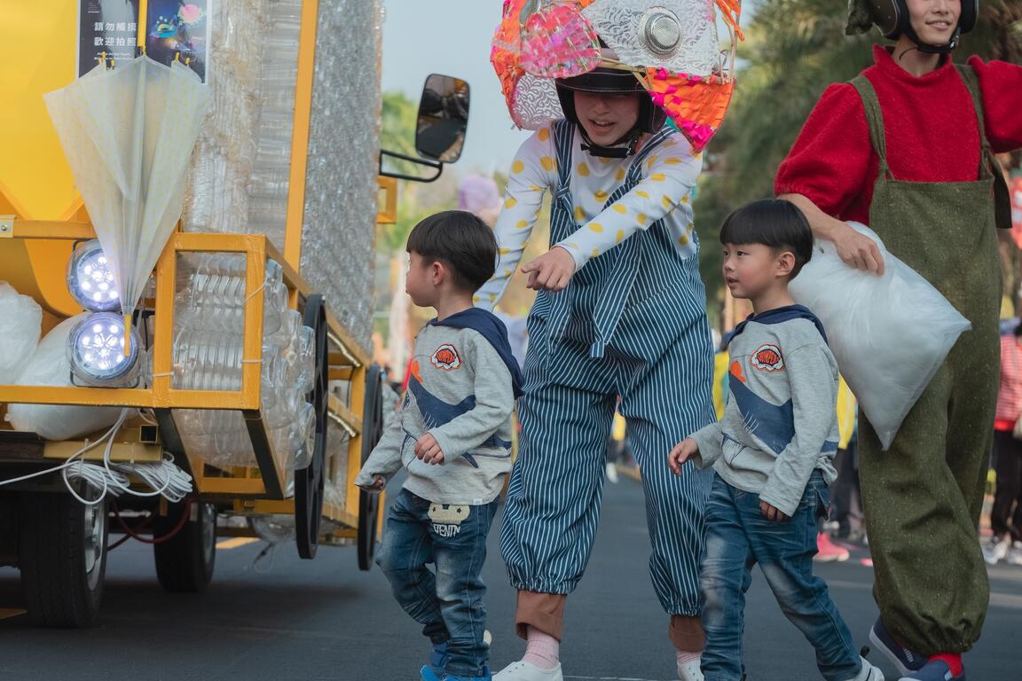 「海洋爵士乐器车」车体则围绕海洋生物,搭配自动化乐器演奏,以及专业乐手吹奏萨克斯风,呈现台湾身为海岛王国及台中爵士音乐节意象;用回收宝特瓶构成的「环保垃圾车」,置入台湾「追垃圾车」文化,由猪小弟领军,邀请大家一起挥别猪年、迎接鼠年。