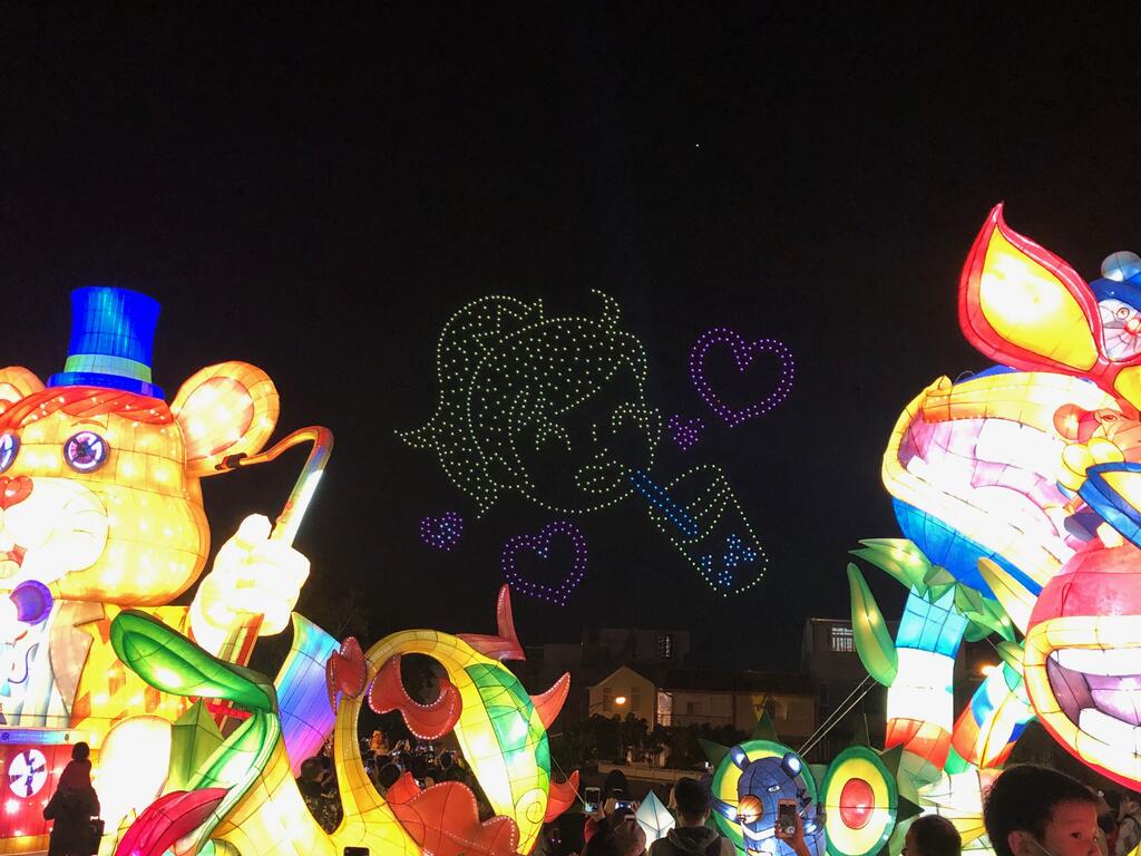 「不仅地上花灯精彩,天上花灯也璀璨!」市府为丰富台湾灯会可看度,邀请无人机团队规划「无人机流星雨展演」,更在闭幕最後两日首创全台规模最大的「800台」无人机展演。
