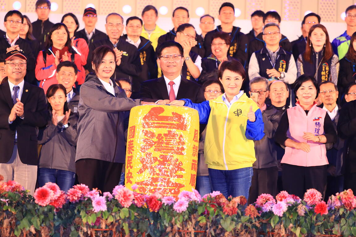 卢市长感谢市府全体同仁及超过5千位有爱有行动力的志工,她表示,同仁以超越常人的意志力、能力和效率,化不可能为可能,完成2020台湾灯会这项超级任务。并指着自己身上的蓝绿拼色外套说,我身上穿的这件夹克就是志工的制服!